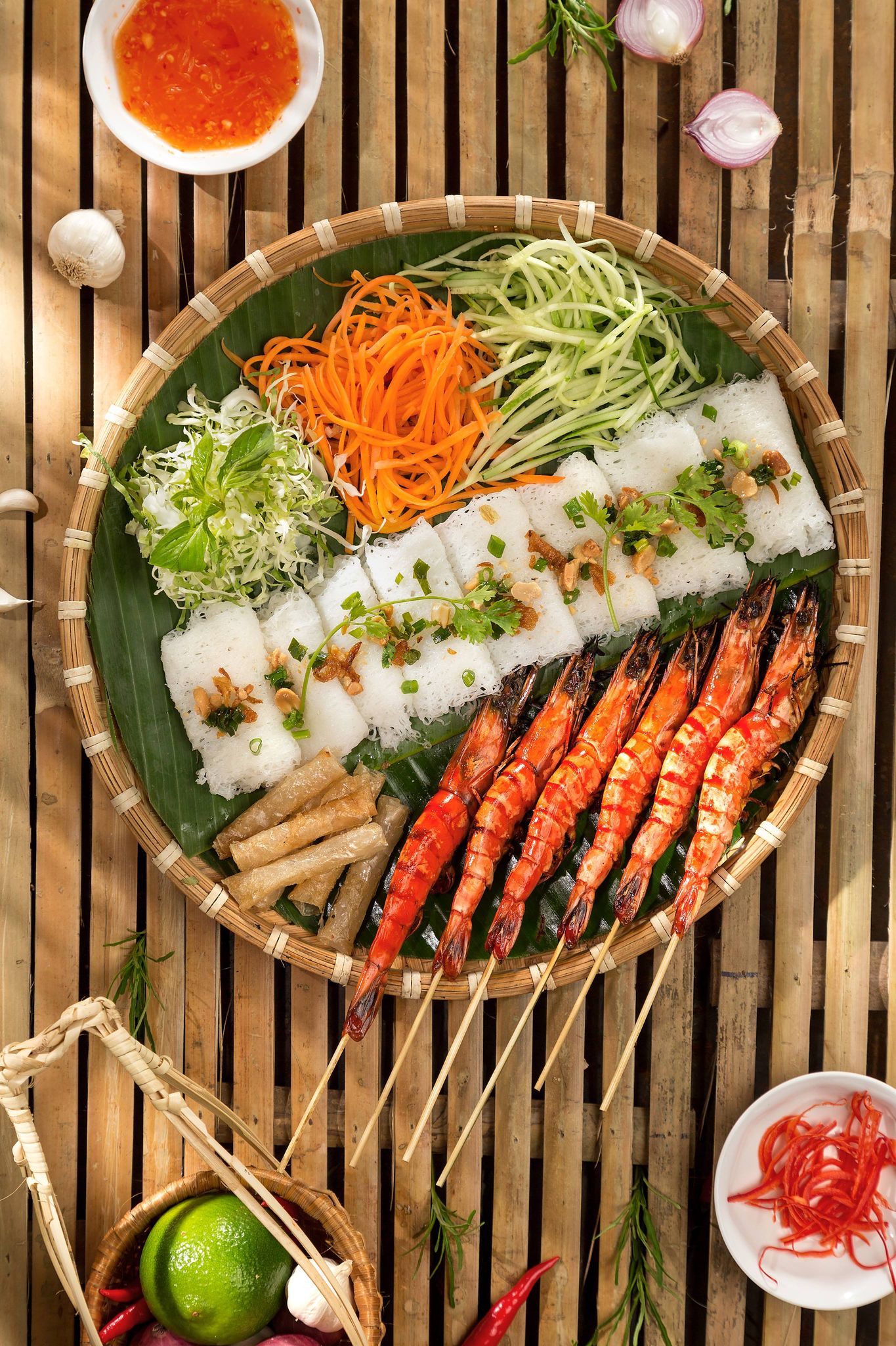 Bánh hỏi tôm nướng là món ăn hấp dẫn giữa cái mềm của bánh hỏi, tôm nướng ngọt thơm, béo béo của mỡ hành & đậu phộng, thanh mát của rau sống. Khi ăn chấm kèm nước mắm chua ngọt bắt vị, ăn hoài không ngán.