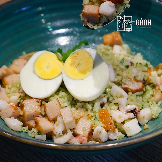 Cơm chiên ớt xanh là món ăn mang đến một hương vị mới lạ bởi sự hòa quyện tinh tế của ớt xiêm xanh miền Trung thơm nồng và vị giòn ngọt của hải sản. Các đầu bếp nhà Gánh chiên áp chảo phần cơm, giúp những hạt cơm vàng giòn và dậy mùi thơm. Khi ăn kèm cùng trứng chấm thêm với nước tương đậu đậm đà, làm trải nghiệm của vị giác càng thêm phần thi vị.