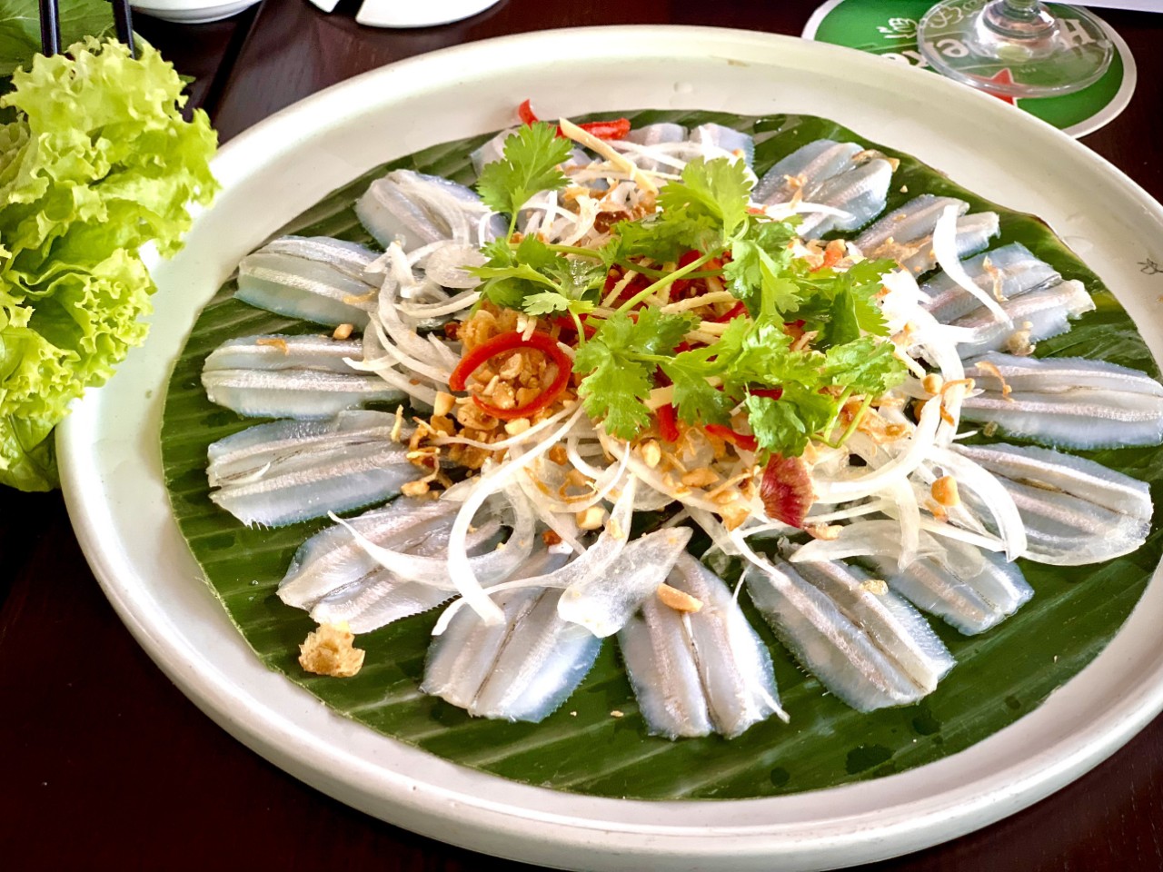 Miếng bánh tráng cuộn bên trong là cá mai tươi, vị ngọt, giòn dai, không tanh, thêm ít lạc rang giòn bùi, rau sống thanh mát, chấm vào nước chấm chua chua cay cay có cảm giác lạ miệng mà cuốn hút vô cùng.